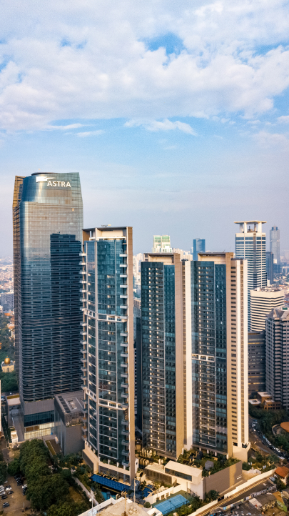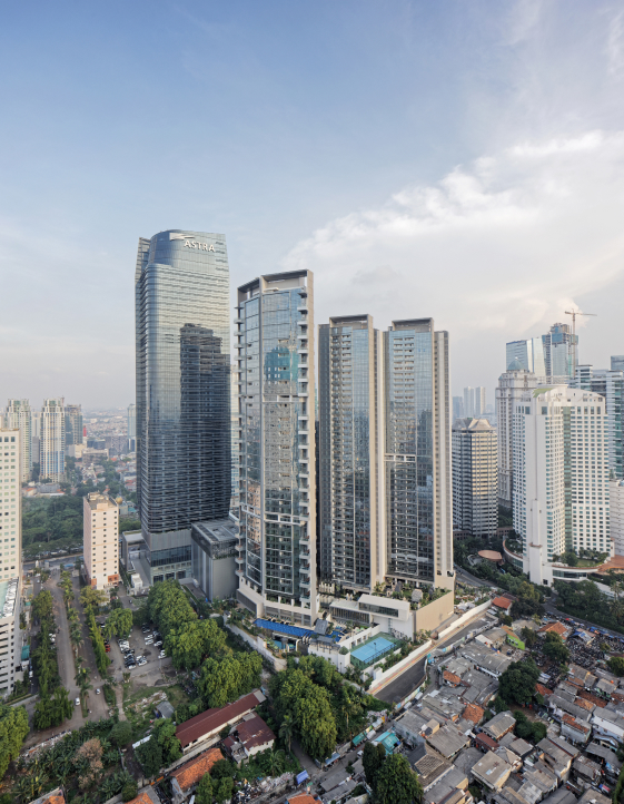 Anandamaya Residences is located along the prominent Jalan Jendral Sudirman in the heart of Jakarta’s CBD, the Golden Triangle. Comprising three towers over 200 meters tall, Anandamaya shapes the city’s skyline with its elegant asymmetry. The name “Anandamaya,” meaning serenity, is meticulously woven into the design, melding luxury with tranquility to create a living environment akin to a lavish resort.
