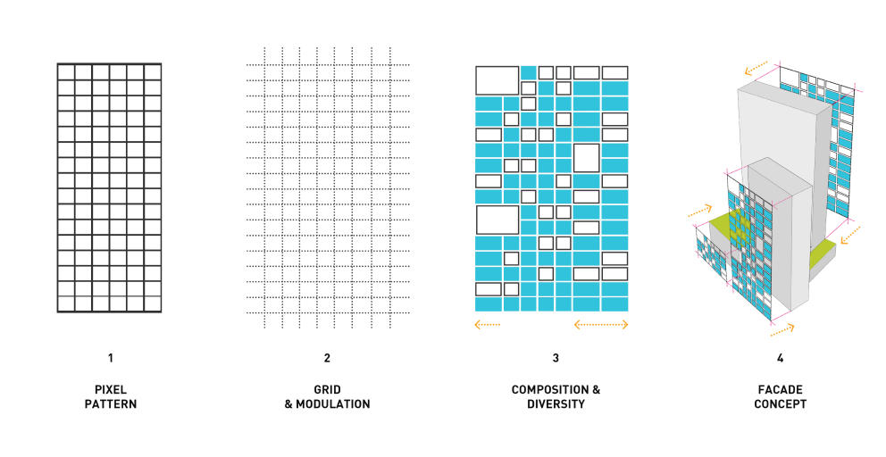 Digihub Apartment’s façade design reflects its innovative views of technology. A pixel pattern on the façade serves as a visual representation of the technological aspects within, showcasing the commitment to smart living and sustainability. In sum, Digihub Apartment redefines modern living by embracing sustainability, intelligence, and community, offering residents an eco-conscious, convenient, and digitally enriched lifestyle.