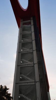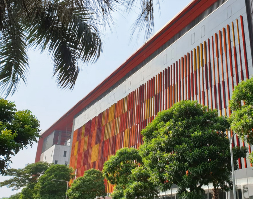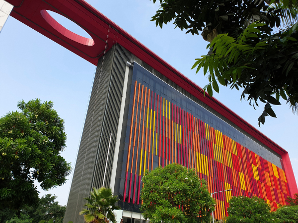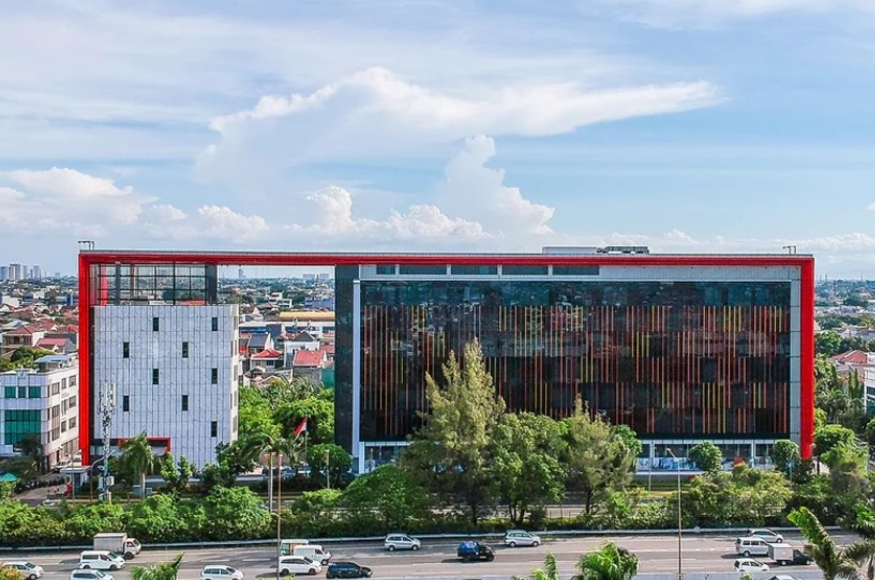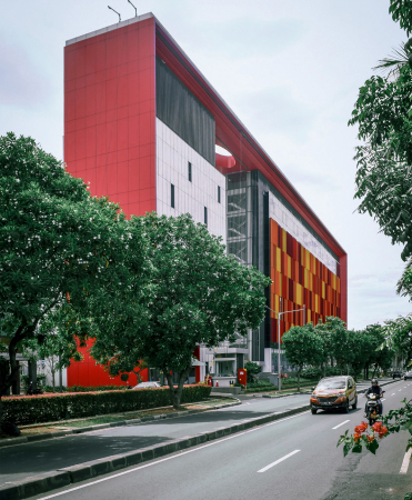 The material and colour choice for House of Roman has been fine-tuned to match the client’s brand identity, which is the reds and yellows found in Roman Ceramics’ corporate logo. One of the unique characteristics of this project is its narrow site shape, furthermore located on the side of a major toll road in West Jakarta. Thus, the design response is to focus on the “planar” characteristic, by playing with rhythm and contrast as shown in the material choices on the facade.