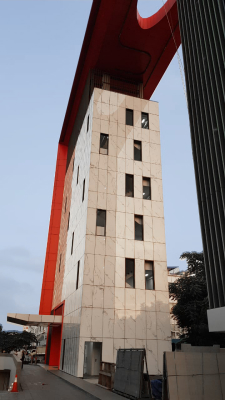Enveloping the east mass of the building, which houses the showroom, white marble-patterned ceramic is used as a unique facade. This is also a way to showcase one of the company’s esteemed ceramic products.