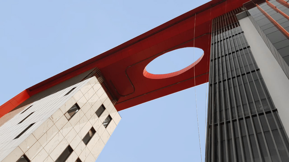 The open area in between the masses are punctuated with a circular hole, framing the sky for the users beneath. A massive sculpture is designed to be placed underneath this, further emphasizing the artistic theme of this building.