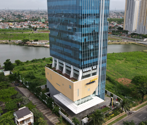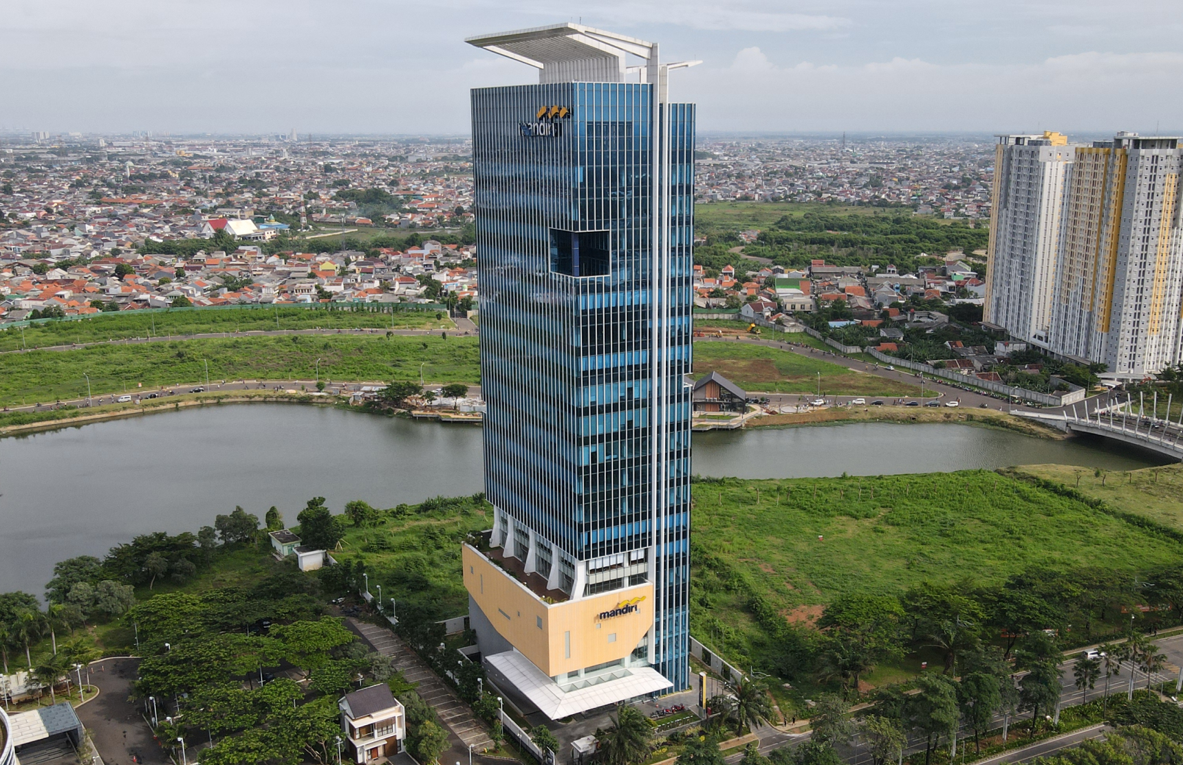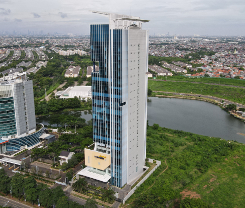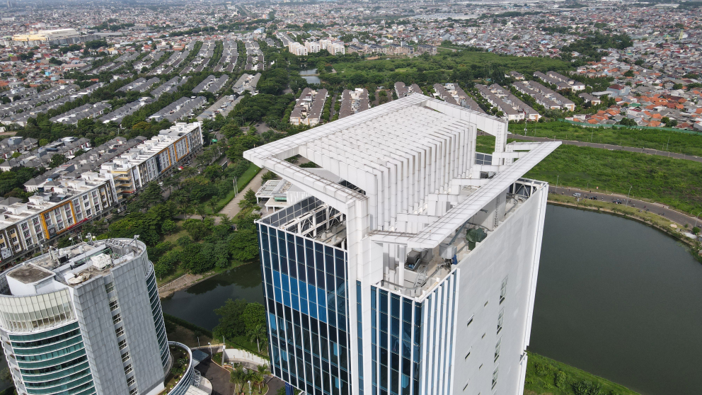 The building’s design is marked by a striking crown and an accentuated podium, capturing the attention of passers-by with its distinctive features. The crown, in particular, is a standout element of the tower, slanting gracefully from the base upwards and dividing into two asymmetrical pieces. Positioned towards the triangle of Summarecon Bekasi, this slanted crown not only adds visual intrigue but also harmonizes the contrast between the podium’s concrete covering and the tower’s glass curtain wall, showcasing a perfect blend of architectural elements.