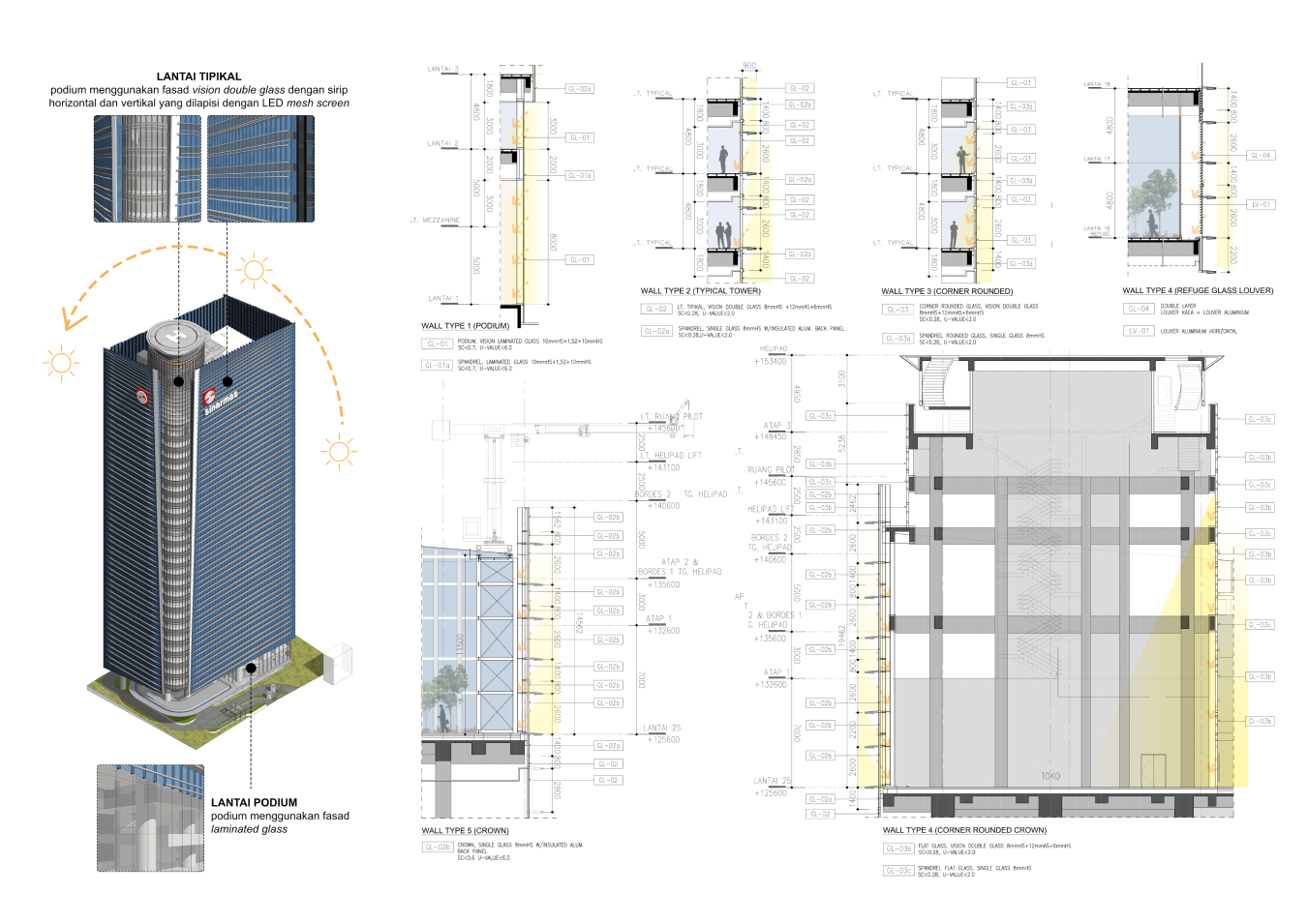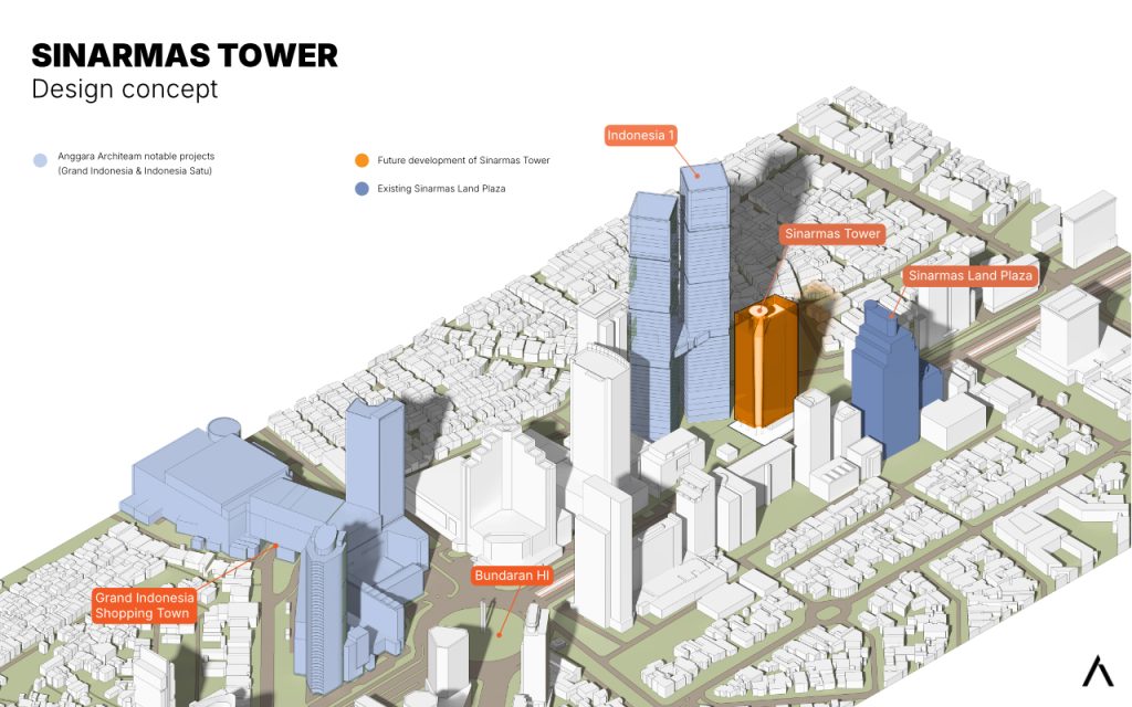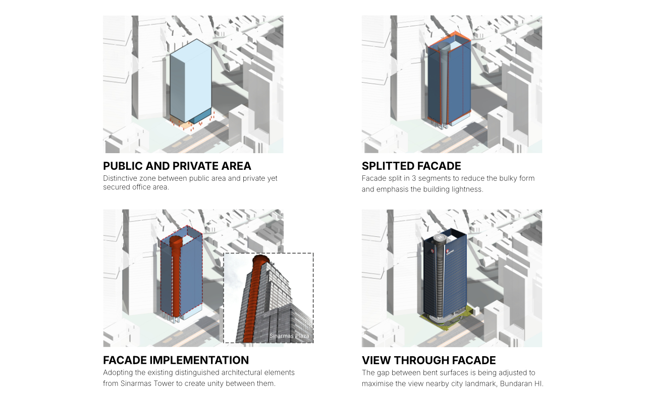 As the site is fully integrated within the existing network of business, entertainment, cultural and commercial, the architectural building has been designed and adapted from its surroundings, including the existing building of Sinarmas Plaza 1 and 2.